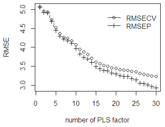 A total of 960 observations which comprised 488 wavelengths (range 550–2500 nm: 4 nm interval) of NIR spectral of fresh fruit mesocarp were used in this study. Following a prior procedure, the cross validation scheme was employed to obtain the RMSECV value in parallel to the increasing number of PLS components. To evaluate the RMSE values both in fitting and prediction ability performance, the scree plot is presented in Figure 7. This plot is essential to observe when the slope starts leveling off and illustrate the gap difference between the RMSECV and RMSEP values. The maximum number of PLS components was limited to 30 for computation efficiency purpose.