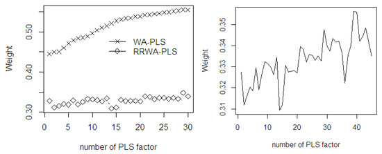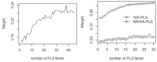 With the increasing number of PLS components, the mean weights of both WA-PLS and RRWA-PLS also increase (see Figure 11). The mean weights of WA-PLS method are comparably higher to the weight in the RRWA-PLS where accuracy is improved by employing a higher number of PLS components. There are some components in the RRWA-PLS with mean weights lower than those of other PLS components although they have a higher number of components. Applying 2 and 5 PLS components results under fitting, while applying 26 and 29 PLS components results in over fitting. The RRWA-PLS shows its robustness which is not dependent on the increasing number of PLS components used. Its weighing scheme is based on the selection of the relevant aggregate number of PLS components used as factors in the PLSR model. The most relevant PLS components will get a higher weight, while the less relevant will obtain a lower weight.