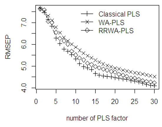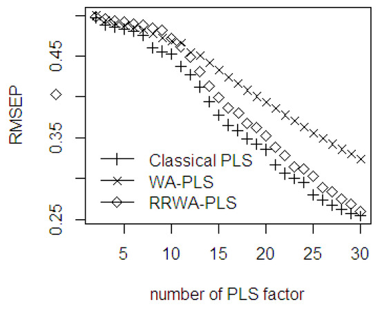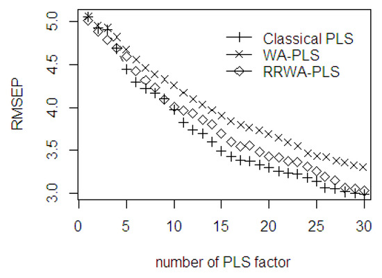 As seen in Figure 9, the prediction ability error between the classical PLS, WA-PLS, and RRWA-PLS are comparable to each other. The first minimal RMSEP was obtained with 7 PLS components. After the 7 PLS components, the WA-PLS produced a higher RMSEP than the classical PLS and RRWA-PLS. The second minimal RMSEP was obtained with 16 PLS components, and the third minimal RMSEP was obtained with 26 PLS components. The classical PLS and RRWA-PLS have similar prediction ability error with 4, 9, 27, 28, 29, and 30 PLS components used in the PLSR model. In general, the RMSEP values using RRWA-PLS method are always within the range and fall around the classical PLS. The RMSEP curve decreases slightly up to 30 PLS components. In an industrial application, the number of factor greater than 30 PLS components is not recommended. Although this would yield better prediction ability, it is computationally intensive.