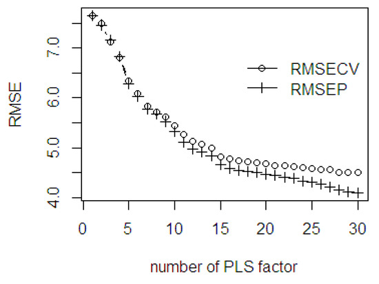 In this section, the %OWM is considered as the response variable of the NIR spectral fresh fruit mesocarp dataset. The evaluation on the RMSE values, both in fitting and prediction ability, is presented in the scree plot. The maximum number of PLS components was limited to 30 for computation efficiency purposes. As seen in Figure 10, the slope of scree plot starts leveling off at 7, 16, and 22 PLS components. The gap difference between the RMSECV and RMSEP values are wider after the 22 PLS components. Contrarily, even though both errors become slightly smaller, a large difference between the RMSECV and RMSEP would lead to over fitting and make the predicted model unstable.