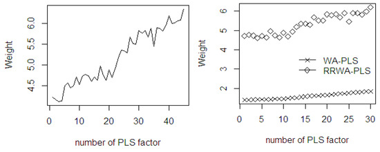 The mean weights of the fitted PLS both using WA-PLS and RRWA-PLS are plotted in Figure 8. It can be seen that the weight of the WA-PLS rapidly increases as the number of PLS components increases. This shows that using a higher number of PLS components improves accuracy. In RRWA-PLS, the weights are relatively comparable as the PLS components increases. It is interesting to observe that by using the weight strategy in RRWA-PLS, some components show lower mean weights compared to the others even though they have less and higher PLS components. For instance, applying 2 and 5 PLS components results in the signal for under fitting while applying 35 and 45 PLS components results in over fitting. The weighting scheme in the WA-PLS and RRWA-PLS depends on the number of PLS components used in the PLSR model. In fact, using a higher number of PLS components may risk in the inclusion of more noise, yielding a larger variation in the predicted model. The WA-PLS is known to be only suitable in preventing a large regression coefficient which indicates an over fitting. Through its corrected weights using reliability values, the RRWA-PLS does not only prevent over fitting but also under fitting.