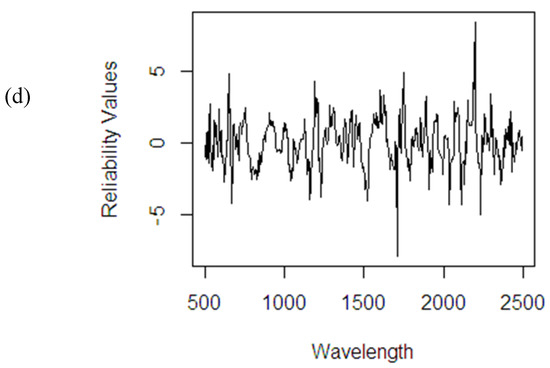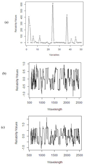 A number of irrelevant variables most probably still exist in the dataset. If the PLSR method fails to screen and downgrade the contribution of these irrelevant variables, it might decrease the accuracy of the final fitted model. The use of RRWA-PLS on the artificial dataset (see Figure 16a) helps the method to screen the most relevant variables and downgrade the irrelevant variables in the dataset successfully. The use of NIR spectral data with different response variables (%ODM, %OWM, and %FFA) has allowed the method to show its potential in the wavelength selection process. The method highlights the most relevant wavelengths and downgrades the influence of irrelevant wavelengths based on spectra absorption (see Figure 16b–d). The reliability values are important in order to increase the computational speed in the fitting process, improve the accuracy, and provide better interpretation of the NIR spectral dataset.