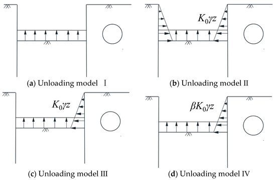 When the two-stage method is adopted in studying the influence of foundation pit excavation on the nearby shield tunnel, the distribution of the soil’s additional stress caused by unloading should be calculated first. The choice of the foundation pit unloading model will directly affect the calculation results of the soil’s additional stress distribution. Zhou et al. [22] believed that stress release on the sidewall was all balanced by the support system, and the sidewall of the foundation pit had no unloading effect on the soil, as shown in Figure 1a. In engineering practice, all the foundation pit retaining structures will deform, and the sidewalls will have the corresponding unloading effect on the soil. Hence, the unloading effect of the adjacent sidewalls cannot be ignored, especially for the shield tunnel by the side of the foundation pit. Zhang et al. [5] took the static earth pressure with triangular distribution as sidewall unloading and superimposed the unloading effects of all foundation pit sidewalls in the calculation process, as shown in Figure 1b, but did not divide the area affected by the sidewall. Jiang et al. [24] believed that only the unloading effect of the foundation pit sidewall adjacent to the tunnel was taken into account, and the static earth pressure at the retaining structure was also used as the unloading, as shown in Figure 1c. Such a method did not consider the role of the retaining structure in bearing earth pressure, which was not reasonable for an internal support structure with enough stiffness.
