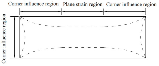 In the foundation pit design, the problem of the foundation pit is often simplified as a plane strain problem. However, in practical engineering, the deformation of the foundation pit presents an obvious spatial effect. As shown in Figure 3, due to the different stiffness of the support structure system and stress state of the soil, the deformation of the area close to the corner of the foundation pit is small, while the deformation of the central area of the longer retaining structure is large, which is similar to the deformation under the plane strain condition. Ou et al. [28] introduced the ratio of plane strain (PSR) to quantitatively describe the influence of the space effect, which is the ratio of displacements of soil mass or retaining structure under a three-dimensional simulation to the displacements under plane strain. Liu et al. [29] studied the spatial effect of the inner bracing foundation pit with different retaining structures. The results showed that the PSR variation trend of the underground diaphragm wall retaining structure was similar to the fitting formula curve proposed by Finno et al. [30]. When the PSR is close to 1.00, the value of the corresponding λ/He ratio is 4.00, and the PSR near the corner is 0.72. By substituting this into the fitting formula, the following equation can be obtained: