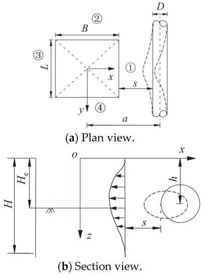 The theoretical model for calculation is shown in Figure 4a,b. The rectangular foundation pit is excavated by the side of the shield tunnel, in which the serial numbers of the four sidewalls are ①, ②, ③ and ④. Let us establish a coordinate system at the center o of the foundation pit on the ground. The x-axis and y-axis are perpendicular and parallel to the tunnel axis, respectively, and the positive direction of the z-axis is vertically downward. The excavation size along the y-axis is L, the excavation size along the x-axis is B, and the excavation depth of the foundation pit is He. The horizontal distance between the axis of the tunnel and the center of the foundation pit is a, the outer diameter of the shield tunnel is D, the buried depth of the tunnel’s axis is h, and the minimum clearance between the retaining structure and the tunnel is s (s = a − B/2 − D/2). The height of the retaining structure within the scope of deformation is H. Therefore, it can be ascertained that the coordinate of any point on the tunnel axis is (a, l, h), where l is the horizontal distance between the calculation point on the tunnel along the y-axis and the excavation center of the foundation pit.