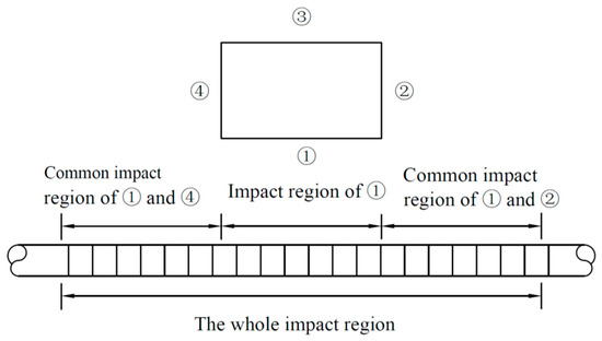 According to the analysis, the interval between foundation pit sidewall ③ and the tunnel is an open space in which the soil has been removed, so the unloading effect of sidewall ③ cannot be passed to the tunnel. Thus, this paper only considered the unloading effect of sidewalls ①, ② and ④ when calculating the additional stress on the tunnel. Meanwhile, this paper divided the impact region on the tunnel, which was affected by the unloading of each sidewall. As shown in Figure 5, the whole impact region can be divided into three parts. The central area of the whole impact region is mainly affected by the unloading of sidewall ①. The left side of the whole impact region is affected by the common impact of sidewalls ① and ④. The right side of the whole impact region is affected by the common impact of sidewalls ① and ②.