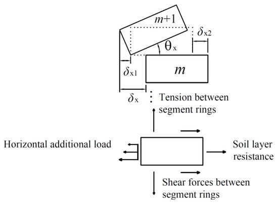 As shown in Figure 7, when the total relative horizontal displacement between the adjacent ring segments numbered m and m + 1 was δx, the relative horizontal displacement induced by the rigid rotation of the segment rings was δx1, the relative horizontal displacement generated by the dislocation of the segment rings was δx2 and the rotation angle between the segment rings was θx. This satisfied the equation δx = δx1 + δx2. Let us set δx1 = jxδx, where jx is the proportionality coefficient for the rotation effects of the segment rings with the horizontal displacement of the tunnel axis (i.e., the ratio of the relative horizontal displacement generated by the rotation between adjacent segment rings to the total relative horizontal displacement). When jx = 0, there is no relative rotation between adjacent segment rings, which is the deformation mode of complete shear dislocation. This is consistent with the deformation model of dislocation proposed by Zhou et al. [22]. When jx = 1, the horizontal displacement is completely caused by the rotation of adjacent segments, which is the deformation mode of complete rotation. According to the research in previous studies [34], the value of the proportionality coefficient jx is 0.1~0.3, and it can be assumed that jx = 0.2 in this study.