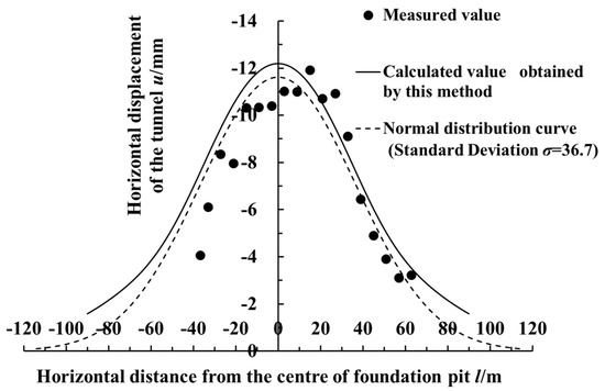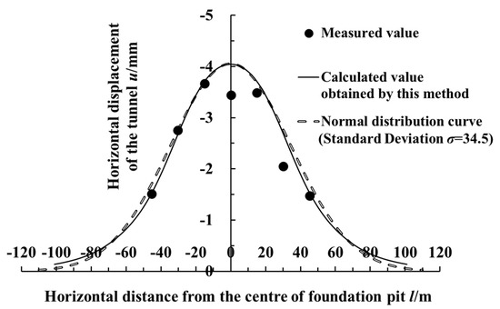 Figure 13 shows the curves which compared the calculated data of the horizontal displacement with the measured data. As shown in the figure, the calculated results were in good agreement with the measured results. At this time, the proportionality coefficient for the rotation effects of the adjacent shield tunnel was jx = 0.2 (i.e., the horizontal deformation caused by the rotation of the segment rings accounted for 20%, while the horizontal deformation caused by the dislocation of the segment rings accounted for 80%). In this case’s calculations, the control parameter of the retaining structure deformation was vmax/He = 0.15% (i.e., the accumulated maximum deformation after excavating each layer in the foundation pit was 0.15% of the excavation depth under this working condition). The accumulated maximum deformation of the sidewall retaining structure in this case was within 15 mm. It can be seen from the figure that the maximum horizontal displacement shown by the measured data was 3.66 mm. In contrast, the maximum horizontal displacement of the side shield tunnel calculated by the method in this paper was 4.04 mm. The horizontal displacement of the tunnel presented a normal distribution, and the tunnel’s horizontal displacement at the center of the excavation was large, while the two sides decreased successively.