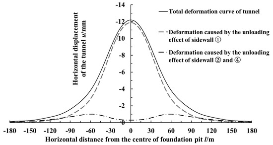 Figure 9 shows the calculated curves of the adjacent shield tunnel’s horizontal displacement caused by the unloading of each sidewall, and the partition of the region affected by the unloading of each sidewall is shown in Figure 5. It can be seen from Figure 9 that tunnel’s horizontal displacement of the total longitudinal deformation was mainly caused by the unloading effect of sidewall ①, while the unloading effects of sidewalls ② and ④ had little influence on the adjacent tunnel. The unloading effect of sidewall ① was mainly concentrated near the excavation center, and its influence range was approximately within 120 m of both sides of the excavation center. The maximum horizontal displacement caused by it was 11.89 mm, which was located in the excavation center and closed to the total deformation of the tunnel. The unloading effects of sidewalls ② and ④ had little contribution to the horizontal displacement of the tunnel near the excavation center. Its main influence range was 15~125 m from the excavation center. The horizontal displacement caused by the unloading effect of sidewalls ② and ④ reached its peak value at about 60 m away from the excavation center, but it was merely 1.01 mm.