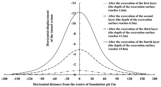 Figure 10 presents the calculated curves of the adjacent shield tunnel’s horizontal displacement after the excavation of each soil layer in the foundation pit during the process of layer-by-layer excavation. It can be seen from the figure that there was little impact on the adjacent shield tunnel, as the excavation thickness of the first layer was small, being only 1.6 m. The excavation thickness of the second floor was 4.9 m, and the depth of the excavation surface reached 6.5 m after completion of excavation. The adjacent shield tunnel began to show a small amount of horizontal displacement, and the maximum horizontal displacement was only 0.83 mm, which still impacted the shield tunnel a little. The excavation thickness of the third layer was 4.8 m, and the depth of the excavation surface reached 11.3 m after excavation was completed. At this time, the accumulated thickness of the excavated soil layer was equivalent to the thickness of the overlying layer on the adjacent shield tunnel, and the shield tunnel began to show relatively obvious longitudinal deformation, with the maximum horizontal displacement reaching 4.88 mm. After the excavation of the fourth soil layer, whose thickness was 4.8 m, the excavation face reached the final depth of 15.8 m, which exceeded the buried depth of the tunnel axis. The horizontal displacement of the adjacent shield tunnel caused by the excavation of the foundation pit had increased dramatically. The maximum horizontal displacement in the vicinity of the excavation center was 12.20 mm, which was close to the final measured values. It can be seen that during the excavation of the foundation pit, the excavation of the deep soil layer had a greater impact on the adjacent shield tunnel, especially when the excavation depth was in the soil layer near the buried depth of the tunnel. The longitudinal deformation of the adjacent shield tunnel would increase sharply, so more attention should be paid to the deformation control of the tunnel in this working condition.