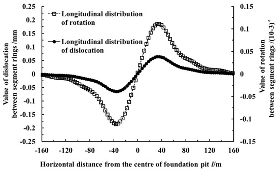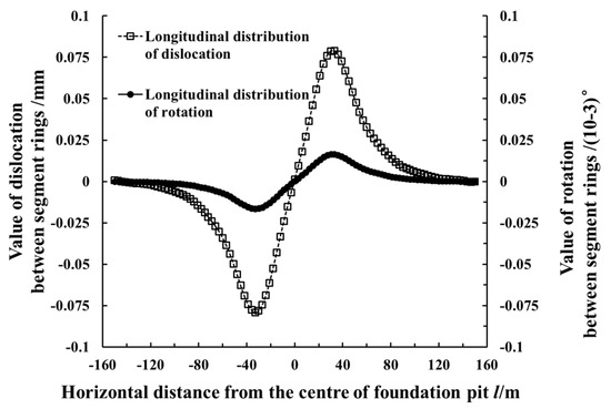 The values of the dislocation and rotation angle between the rings are important to the safety of the tunnel structure and waterproofing system. The greater the rotation angle between the rings, the greater the opening of the ring seam. The probability of leakage in the shield tunnel will be greatly increased when the values of the seam opening and dislocation between the rings are large. Therefore, it is necessary to estimate the value of the seam opening and dislocation between the rings. Figure 11 shows the calculated curves of the shield tunnel segment dislocation and rotation between the rings. As shown in the figure, the dislocation and rotation between the segment rings were close to 0 at the center of the foundation excavation. This means that there was almost no dislocation or rotational deformation between the segment rings near where the value of the shield tunnel’s horizontal displacement was at its maximum. The maximum segment dislocation was 0.19 mm, and the maximum rotation angle between the rings was 3.87 × 10−5 degrees. Both of them appear near the two inflexion points of the displacement curve in Figure 11, with a 36 m horizontal distance to the center of the foundation excavation.