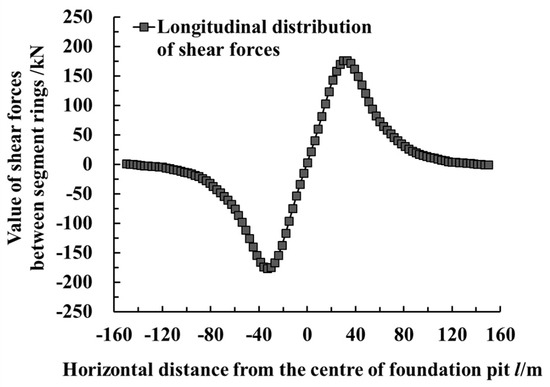 Figure 14 shows the longitudinal distribution curves of the calculated dislocation and rotation angle between the shield tunnel segment rings. As shown in the figure, the dislocation and rotation angle between the segment rings at the position of maximum horizontal displacement were basically equal to zero. The maximum dislocation and rotation angle between the rings occurred at the inflexion point of the horizontal displacement curve. The maximum values were 0.08 mm and 1.65 × 10−5 degrees, respectively. Figure 15 shows the distribution curve of the calculated shear force between the adjacent shield tunnel segment rings. As shown in the figure, the shear force between the adjacent segment rings was the largest at a horizontal distance of 33 m from the excavation center, with a maximum value of 176.66 kN.