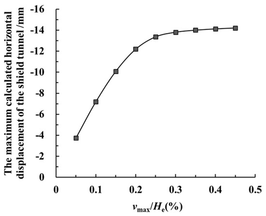 The variation curve of the maximum calculated value of the shield tunnel’s horizontal displacement with different values of vmax/He.