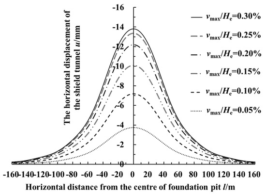 Taking Case History 1 in this paper as the basic working condition changed the deformation control parameter (vmax/He) of the foundation pit’s retaining structure under the condition that the other parameters remained constant. Figure 16 shows the curve of the maximum calculated value of the horizontal displacement of the shield tunnel by the side of the foundation pit changing with the deformation control parameter (vmax/He) of the retaining structure. As shown in the figure, when vmax/He = 0.25%, the maximum horizontal displacement of the shield tunnel adjacent to the foundation pit reached 13.37 mm. When vmax/He increased to 0.30%, the deformation of the retaining structure in this numerical example was controlled within 47.4 mm. At this time, the horizontal displacement distribution of the shield tunnel already changed a little, with a maximum increment of horizontal displacement of about 0.5 mm. This was because the soil mass at the maximum deformation of the retaining structure was close to the limit state. The deformation of the retaining structure continued to increase, while the increase of the sidewall unloading was not obvious. Figure 17 shows the longitudinal distribution curve of the calculated horizontal displacement value of the shield tunnel by the side of the foundation pit when the deformation control parameter vmax/He was taken as 0.05%, 0.10%, 0.15%, 0.20%, 0.25% and 0.30%, respectively. As shown in the figure, when vmax/He = 0.05%, the deformation of the retaining structure in this calculation was controlled within 7.9 mm. Meanwhile, the horizontal displacement of the shield tunnel by the side of the foundation pit was small, with a maximum horizontal displacement of 3.74 mm. With the increase of the deformation control parameter (vmax/He) of the retaining structure, the shield tunnel’s horizontal displacement value and the influence range of longitudinal deformation also increased.