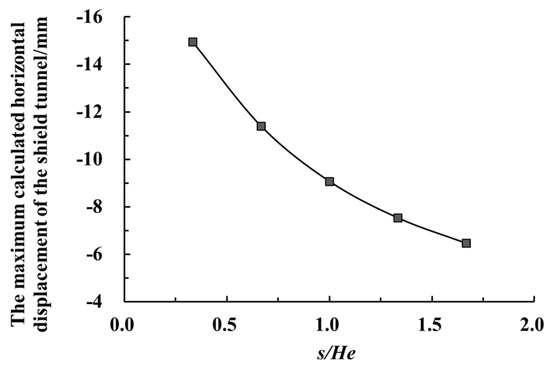 Let us take Case History 1 in this paper as the basic working condition, under the condition that the other parameters remained constant and only changing the clearance s between the foundation pit and the adjacent tunnel. Figure 18 shows the maximum calculated horizontal displacement of the shield tunnel by the side of the foundation pit, which changed with the ratio of clearance s to the excavation depth He. Figure 19 shows the longitudinal distribution curve of the calculated horizontal displacement value of the shield tunnel by the side of the foundation pit when clearance s equaled 1/3 He, 2/3 He, He, 4/3 He, 5/3 He, respectively. As shown in Figure 18 and Figure 19, with the increase of the clearance s, the adjacent shield tunnel’s horizontal displacement decreased. The main influence range was within 100 m from the center of the excavation.