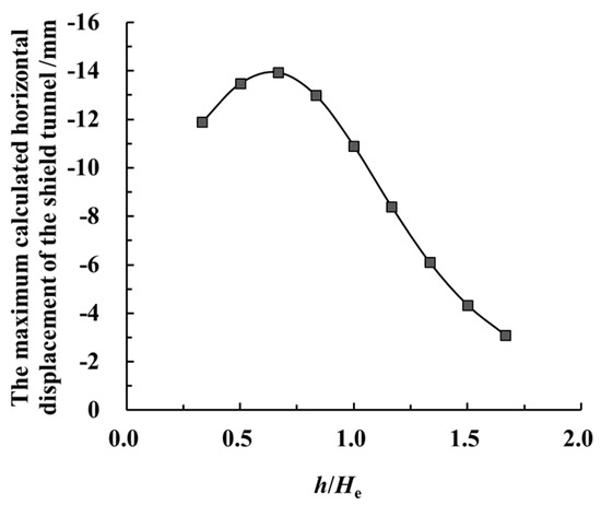 The changing curve of the maximum horizontal displacement (calculated) of the adjacent shield tunnel with different h/He values.