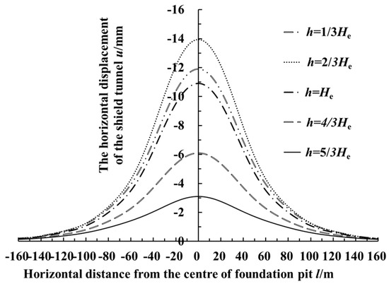 Taking Case History 1 in this paper as the basic working condition, under the condition that the other parameters remained constant, only the buried depth h of the tunnel by the side of the foundation pit was changed. Figure 20 shows the maximum calculation value of the horizontal displacement of the shield tunnel by the side of the foundation pit, changing with the ratio of the buried depth of the tunnel axis to the excavated depth. Figure 21 shows the longitudinal distribution curve of the calculated horizontal displacement value of the shield tunnel by the side of the foundation pit when the buried depth h equaled 1/3 He, 2/3 He, He, 4/3 He, and 5/3 He, respectively. As shown in Figure 20 and Figure 21, the excavation of the foundation pit had a great impact on the adjacent shield tunnel with a shallow burial depth. In this calculation, the horizontal displacement of the adjacent tunnel was the largest when the depth of the tunnel axis was about two-thirds of the excavation depth. At this time, the excavation face was about 2 m below the bottom of the tunnel. Subsequently, with the increase of the adjacent shield tunnel’s buried depth, the horizontal displacement of the tunnel caused by the excavation of the foundation pit obviously decreased. Meanwhile, the influence range of the longitudinal deformation of the shield tunnel also decreased.