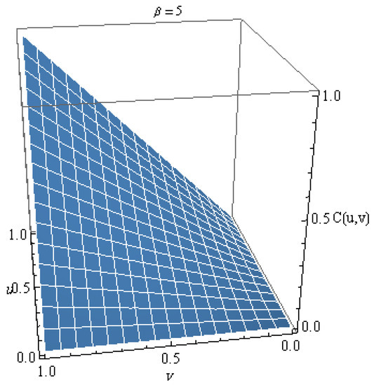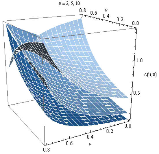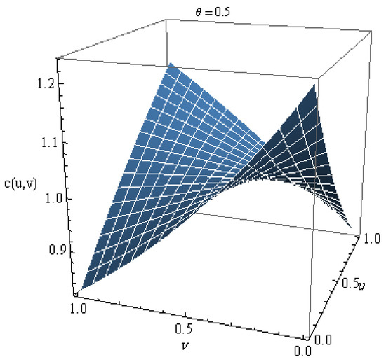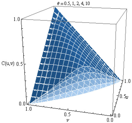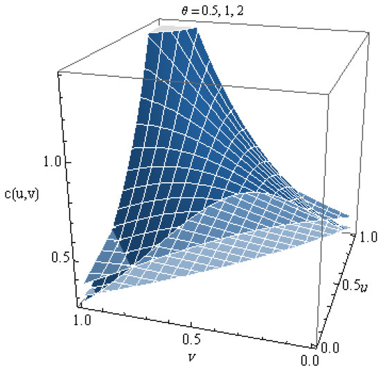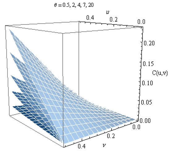 The plot of this copula for different values of is shown in Figure 1. From the graph, we can notice that this copula is increasing in . Figure 2 shows the density for several values of , where the density copula is given by