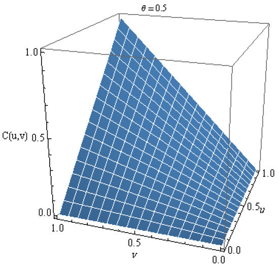 Now consider the function . Then, W is decreasing and convex. Also, and . Thus, it is a non-strict additive Archimedean generator. Hence, we can get the following result as an immediate consequence of Corollary 1.