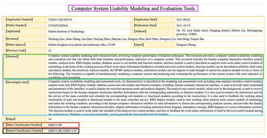 - Zuo, D.; Zhang, Z.; Qian, J.; Zhou, H.; Luo, D.; Wen, D.; Miao, B.; Liu, H.; Dong, J.; Shu, Y. Computer System Usability Modeling and Evaluation Tool. Chinese CN102222024A, 19 October 2011. Available online: http://dbpub.cnki.net/grid2008/dbpub/detail.aspx?dbcode=SCPD&dbname=SCPD2011&filename=CN102222024A&uid=WEEvREcwSlJHSldRa1FhcTdnTnhXM281cEdHa0o5bTQ1ZHlUd3YrcTFwND0=\protect\T1\textdollar9A4hF_YAuvQ5obgVAqNKPCYcEjKensW4IQMovwHtwkF4VYPoHbKxJw!! (accessed on 15 January 2020).