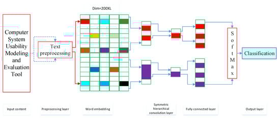 CNN has been widely used in the areas of speech recognition, image processing and natural language processing, et al. We construct a hierarchical CNN Model PAC-HCNN based on the Tensorflow platform [23]. The whole PAC-HCNN framework consists of six Layers: Input layer, preprocessing layer, word embedding layer, hierarchical convolution layer, fully connected layer, and output layer. The framework overview of the proposed framework is shown in Figure 2.