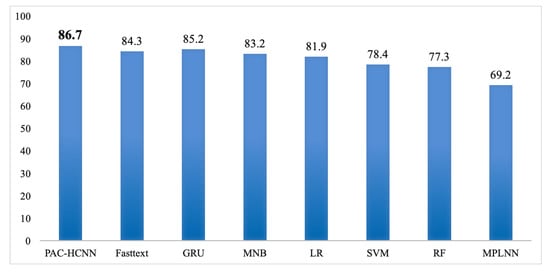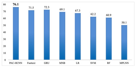 In order to comprehensively examine the classification performance of PAC-HCNN, we compare it with seven state-of-the-art algorithms including Fasttext, gated recurrent unit (GRU), multinomial naive Bayesian (MNB), logistic regression (LR), support vector machines (SVM), random forest (RF) and multi-layer perceptron neural networks (MPLNN). For those models using conventional CNN, we only adopt Fasttext as it achieved the best results reported in its original paper. Except for the PAC-HCNN, Fasttext and GRU, the other models are implemented using the corresponding algorithms in the Scikit-learn [26] toolkit. We conduct both coarse-grained and fine-grained classification. For fine-grained classification, we use the C_Dateset_ in which patent class having 50 category labels. In all the experiments, we use the average value as a comprehensive evaluation metric. We also adopt a paired two-tailed t test with between our model and the other models. The experimental results are shown in Figure 3 and Figure 4.