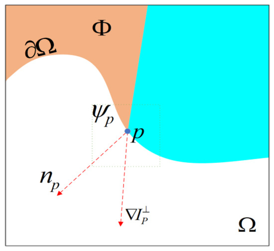 For input image , as shown in Figure 1, is the area for inpainting, is the boundary line of the area to be repaired, is the sample block to be repaired centered on point on , is the normal vector of point , is the equal illumination line of point (the line connected by pixel points with the same gray level), and is the area where the information is completed.