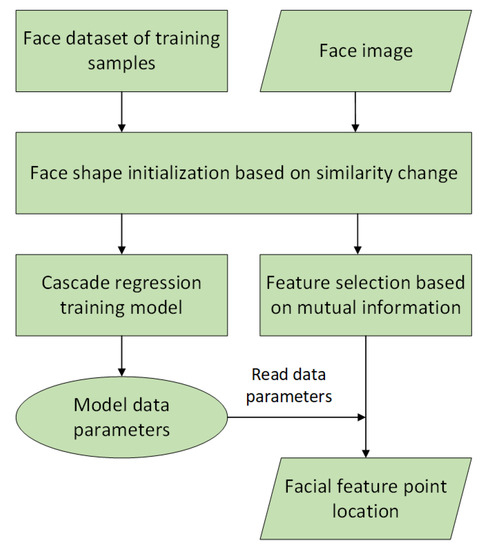 For face image inpainting, based on explicit shape regression (ESR) [32] and facial feature point location, an adaptive window regression method model [33] is used to initially locate the facial feature points. The core of this model includes face shape initialization, adaptive adjustment window stable prediction results, and feature selection based on mutual information correlation calculation. The algorithm flow is shown in Figure 2.