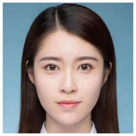 - The feature point set is determined by the adaptive window regression model of facial feature point location, and the feature point set is classified as , representing the left eyebrow feature area, right eyebrow feature area, nose feature area, mouth feature area, and face contour region, respectively.