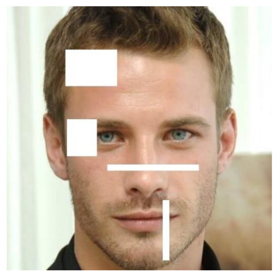 The experimental image was a 512 × 512 face image extracted from the original photo, and a mask was artificially added to the facial feature part of the experimental image to simulate a damaged face image. The effect is shown in Figure 4.