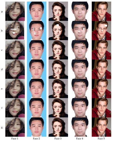 Results of different algorithms for face inpainting (in this figure, a describes the original face image; b describes the simulated face damage image; c–f describe the results of face image inpainting of References [17,29,30,31], respectively, and g describes the results of our algorithm in this paper).