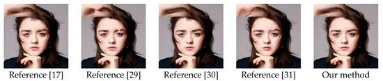 Compared with the reference methods using a global search scheme, our method searches in a large circular area of feature parts when searching for matching blocks; thus, it has an absolute advantage in terms of time consumption. In order to objectively verify the time superiority of our method, the time consumption of each experiment in Figure 5 is shown in Table 3. As can be seen from the table, the time consumption of the repair method was closely related to the image size and the number of broken pixels. Reference [31] consumed the most time, because this method needs to decompose the face image into the skeleton part and the texture part to obtain the sparse coefficient to repair the face image, which increases the time consumption of the algorithm. The method of Reference [30] uses the adaptive optimization method to estimate the balance of the repaired area; thus, the experiment time is relatively better than the methods of References [17,29,31]. Our method firstly locates the feature area of the face, then reduces the search range of the local matching block, and adaptively repairs the damaged area of the face image based on the symmetry of the local feature of the face, which results in accurate inpainting of the target domain, as well as a shortened inpainting time.