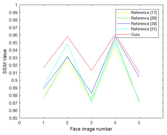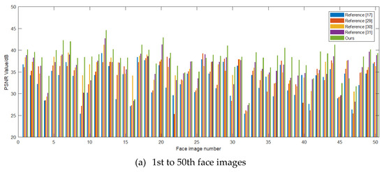 In addition, in the experiment, we calculated the PSNR values of each algorithm when repairing 100 damaged face images, and the experimental results of 100 face images are shown in Figure 8. For the PSNR value when 100 face inpainting images, there were only five face images with performance lower than the comparison methods. The average PSNR values of References [17,29,30,31] in the comparison experiment were 32.916 dB, 33.631 dB, 35.074 dB, and 35.811 dB, and the average PSNR value of our algorithm was 38.692 dB. Compared with the comparison algorithm, the PSNR was improved by 2.881–5.776 dB, which further demonstrates the effectiveness of the algorithm in this paper.