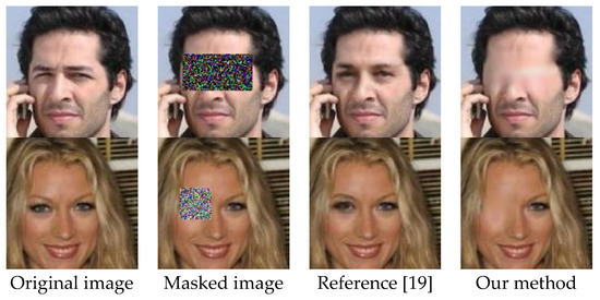When a face image contains large defect areas, especially when the local feature information of the face is completely lost, the face image inpainting algorithm based on graphics struggles to achieve a good inpainting effect. With the development of machine learning, especially the emergence of the generative adversary network (GAN), a face image inpainting algorithm based on deep learning can effectively solve the above problems. We carried out an experimental comparison between our method and the GAN method (Reference [19]) for face image repair with large areas of missing features, the face image inpainting results are shown in Figure 9. Because our algorithm improves the face image inpainting algorithm based on graphics and introduces feature symmetry, when inpainting a face image with missing local feature information, it was impossible to correctly obtain similar feature matching blocks to fill in the missing region, and the surrounding skin features were incorrectly selected to fill the missing region of the face image. Therefore, it is shown that the improved method based on feature symmetry in this paper still cannot overcome the shortcomings of face inpainting algorithms based on graphics that cannot obtain high-level structural features and semantic information of large areas of missing feature information during face image inpainting. The face image inpainting method based on deep learning uses a trained GAN model to generate an image closest to the non-missing part of the original image, and uses part of the GAN loss function to train the discriminator as the prior loss. Visually, it guarantees the authenticity of the face image. However, whether the missing features of the face image generated by GAN are consistent with the original features and can be gradually applied to fields such as face recognition is an academic issue worthy of discussion.