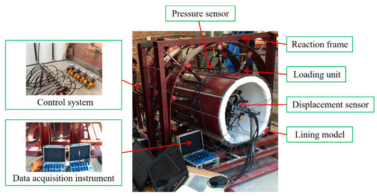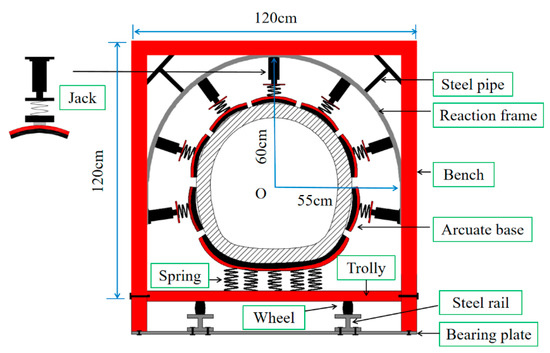 The test platform uses a three-dimensional full-cycle loading device. The test platform is mainly composed of five parts: bench, reaction frame, wheel-rail device, loading system, and measurement system. The dimensions of the bench are 120 cm × 120 cm (width × height). The overall layout of the loading system is shown in Figure 2. In order to simulate the stress of the tunnel, jacks on the top are used as vertical loading groups to simulate vertical earth pressure, and the other jacks are used as horizontal loading groups to simulate lateral earth pressure. The whole test is completed under symmetrical loading mode.