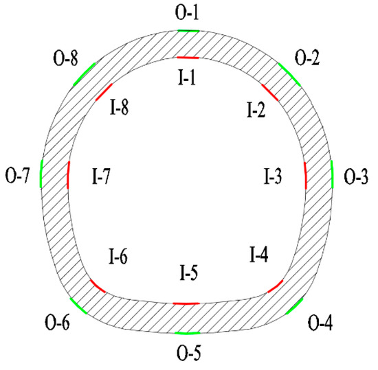 The model test included a pre-preparation, experimental loading, and data acquisition and analysis phase. In order to keep the loading process stable, the experimental loading should be kept slow, and the jacks of the symmetric points should be simultaneously raised to ensure that the lateral pressure coefficient is around 0.4 (the lateral pressure coefficient is determined by the actual engineering). After the graded load, the oil pressure was kept constant and the load of each stage was stable for more than 5 min. The crack development and the whole gypsum model change were observed throughout the stationary stage of loading. The trend of crack propagation and the change of geometry were observed over time. The model experiment ended with main through-cracks appearing and the lining structure deforming sharply. The measurement system includes a pressure sensor, displacement sensor, strain gauge, and data acquisition system. The overall layout of the test platform can be seen in Figure 3. Concrete strain gauges were arranged on the inner and outer surfaces of the middle part of the model. As shown in Figure 4, 16 strain gauges were arranged on the lining, O1–O8 on the outside of the lining and I1–I8 on the inside.