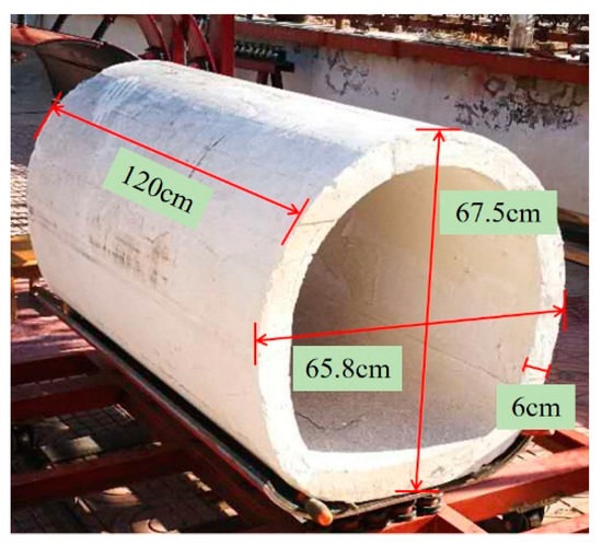 The primary lining prototype was cast in situ with C25 shotcrete, and the secondary lining prototype is a reinforced concrete structure with C40 concrete. In this test, the primary and secondary lining were poured with C30 concrete simultaneously. The mechanical parameters of the lining are based on actual engineering. The elastic modulus and compressive strength of the lining are 30 GP and 30 MPa, respectively. The parameters of the materials are shown in Table 1. The cross-section of the lining shows a two-lane and five-center-circle section; the thickness is 0.6 m (including primary and secondary lining), the span length is 6.58 m, the height is 6.75 m, and the axial length is 12 m. The dimensions of the model are 120 cm × 65.8 cm × 67.5 cm (length × width × height) and the thickness of the lining is 6 cm. The dimensions of the model are shown in Figure 5.