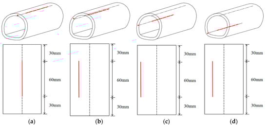 Diagram of prefabricated cracks at different positions: (a) test 2; (b) test 3; (c) test 4; (d) test 5.