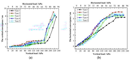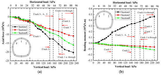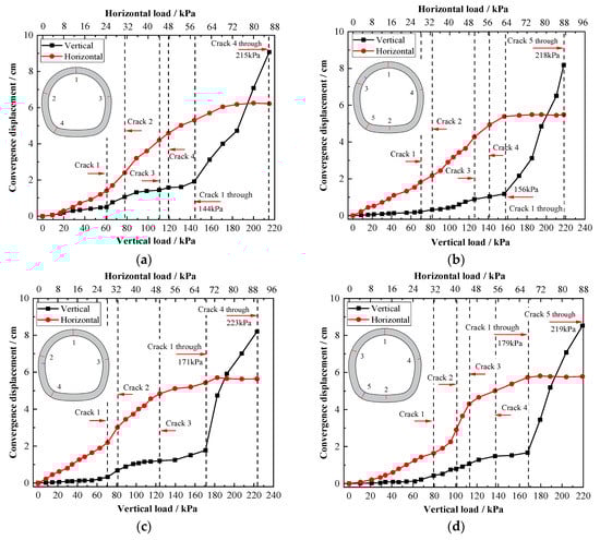 The distribution of lining internal force in the ultimate state is shown in Figure 14. It can be seen that the overall variation in vertical and horizontal convergence curves of the tests is similar. When the external load was between 0 and 70 kPa, the speed of horizontal deformation was significantly higher than that of vertical convergence. The vertical and horizontal convergence ratio increased after crack 1 appeared. When crack 1 became a through-crack, vertical convergence increased sharply until the crack at the left arch spring was through, then the model lost its carrying capacity. However, the horizontal convergence curve became gradually stable at this stage.