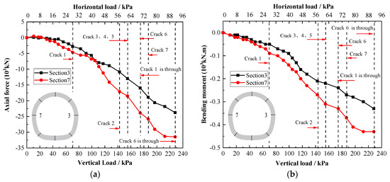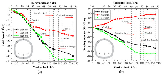 Internal force curves of the lining on the sidewall are shown in Figure 8. The axial force and bending moment of monitoring points 3 and 7 were similar. When the load was in the range of 0 to 70 kPa, axial force and bending moment increased slowly. After crack 1 appeared, the increased ratio of axial force and bending moment of monitoring point 7 was greater than that of monitoring point 3, until a tension crack appeared on the outside of the lining near monitoring point 7. As the external load continued to increase, tension cracks 4 and 5 appeared near monitoring point 3.