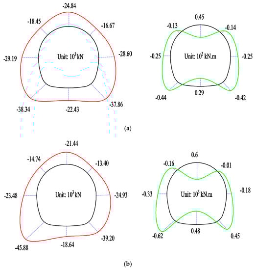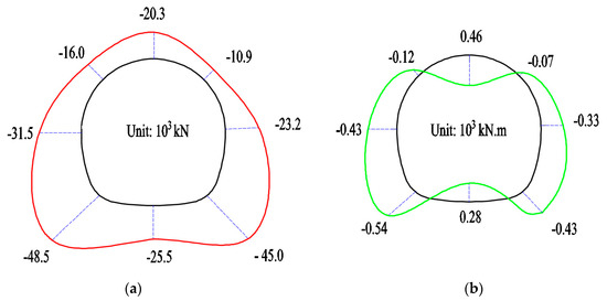 Distribution of lining internal force in the ultimate state: (a) axial force; (b) bending moment. (The green line represents axial force, and the red line represents bending moment.)
