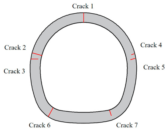 An internal force diagram of lining failure is shown in Figure 10. The positive bending moments appeared at the inverted arch and crown, indicating that the inner side of the lining was under tension. It shows that the axial force of the substructure of the lining was larger than that of the superstructure, and stress concentration occurred at both arch springs. Due to the uneven distribution of structural materials and other factors in the process of model making, the internal force on the left side of the lining was a little bit larger than that on the right side. Finally, the crack at the left arch spring penetrated, and the lining structure lost its carrying capacity. In terms of the bending moment, the internal lining of the vault and inverted arch was subjected to tension, and a tension crack first appear at the vault crown, while the bending moment of the left side wall and the arch spring was greater than that of the right side. The distribution of cracks of the lining is depicted in Figure 11.