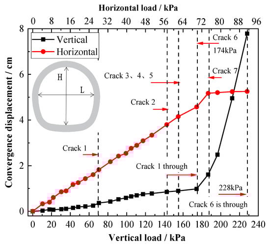 To investigate the deformation law of the lining during the test, vertical and horizontal convergence of the lining are analyzed in this part. Figure 12 shows the relation curve between deformation and load. When the external load was between 0 and 70 kPa, vertical convergence increased slowly, and horizontal displacement increased linearly with the increased load. When crack 1 appeared, the vertical convergence ratio increased, and when the load reached 174 kPa (through-crack 1), vertical deformation increased sharply. The appearance of through-crack 1 indicates that the vault of the lining was damaged, decreasing the load transferring from the arch to the sidewall. At this time, horizontal displacement tended to be gentle, however, vertical deformation increased sharply until structural failure occurred. It can be concluded that vertical displacement was greatly affected by the crack at the vault, while the appearance of cracks in other parts of the lining had little influence on vertical deformation.