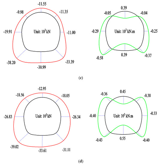 Distribution of lining internal force in the ultimate state: (a) test 2; (b) test 3; (c) test 4; (d) test 5. (The green line represents axial force, and the red line represents bending moment.)