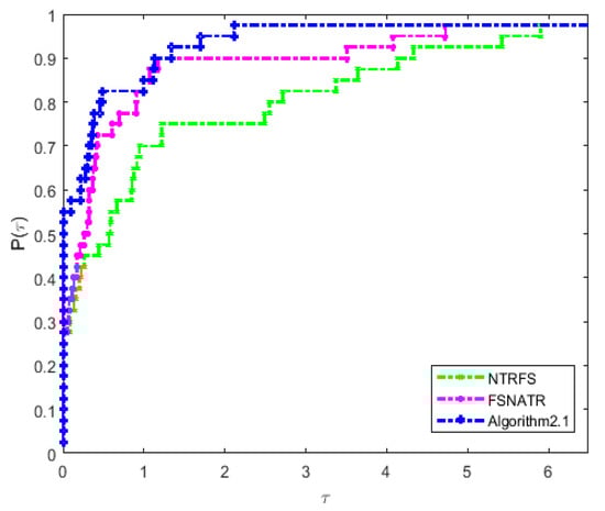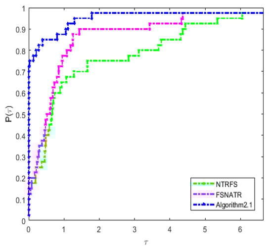 From Table 1, there are some variable dimension problems, which select the dimension in the range [4,1000]. We know that the new algorithm is generally better than NTRFS and FSNATR in terms of the total number of gradient evaluations and function evaluations. The new algorithm solves all the test functions in Table 1. The performance profiles given by Dolan and Moré [] are used to compare the efficiency of the three algorithms. Figure 1, Figure 2 and Figure 3 give the performance profiles of the three algorithms for running time, the number of gradient evaluations, and the number of function evaluations, respectively. The figures show that Algorithm 1 performs well when compared with the other algorithms, at least on the test problems considered, which are mostly of small dimension. It can be observed that Algorithm 1 increases faster than the other algorithms, especially in contrast to NTRFS. Therefore, we can deduce that the new algorithm is more efficient and robust than the other considered trust region algorithms for solving small and medium-scale unconstrained optimization problems.