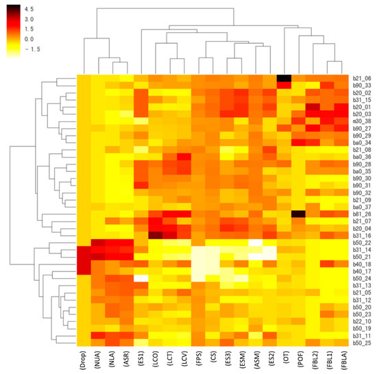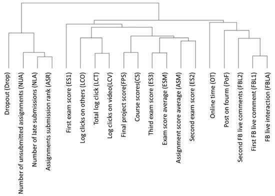 The color depth of the heat map represents the original value. Since the data were standardized, the maximum value was about 4.5, and the minimum value was about −1.5. From the hierarchical structure on the left, we can see the learner’s grouping and understand which learners’ learning behaviors were similar. Moreover, the relationship between the variables can be seen from the hierarchical structure above; so we can understand the degree of association between the variables. The correlation between the variables is one of the links that the instructor wants to explore. Therefore, the variable hierarchy above the hierarchical group heat map is represented separately from the disguised name below, as shown in Figure 2.
