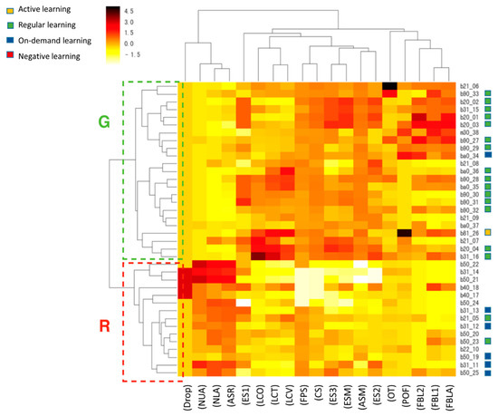 In the questionnaire, the question “I think my learning model for this semester” had four options, as shown in Table 3, namely “Active learning”, “Regular learning”, “On-demand learning”, and “Negative learning”. Active learners are not only able to learn the learning content uploaded by the teacher, but also actively learn additional knowledge and can actively ask questions or actively help students to answer questions. Regular learners learn the learning materials weekly and submit their assignments on time; on-demand learners are unable to complete the learning content on time every week, and negative learning refers to students who are too busy to undertaken this course. We then cross-analyzed the four types of student self-identified learning patterns and hierarchical group heat maps, as shown in Figure 4.