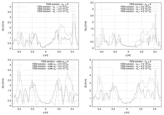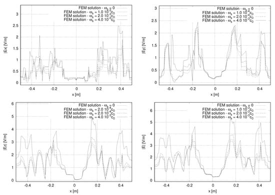 In this case, the total field is also largely similar to the z component and the difference from the stationary solution is about three times the incident field. For the other speeds considered, the rotational effects on the fields are quite small along this direction. Finally, we do not show the behaviour of the electric field along the z-axis because, in this case, the effects due to motion for all the components are quite small (less than 2 percent) for the speeds considered.