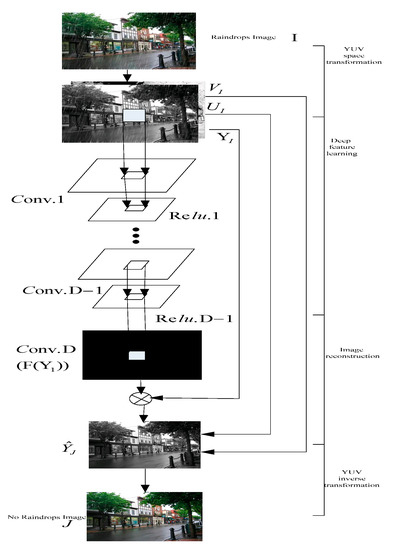 The algorithm consists of four parts: YUV (luma chroma) spatial transformation, deep feature learning, image reconstruction and YUV inverse transformation [16]. YUV space transformation transforms the denoised raindrop image from RGB space to YUV space to obtain the brightness component and color component of image ; deep learning extracts the residual component of the denoised raindrop source image and the residual component of the ideal recovered image without raindrop, i.e., , where represents network mapping; In image reconstruction, the learned residual image and the luminance component are superposed again to obtain the luminance component of the reconstructed image. the inverse YUV transform restores the reconstructed image to RGB space, and the final color image without rain is obtained.