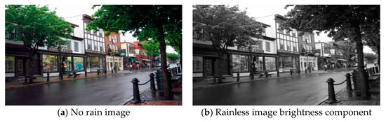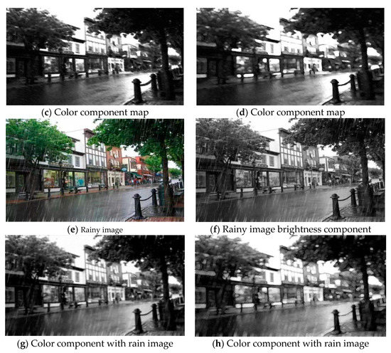Compared Figure 2b with Figure 2f, Figure 2c with Figure 2g, and Figure 2d with Figure 2h, it is not difficult to find that the raindrops in Figure 2e mainly exist in the brightness component with high resolution (as shown in Figure 2f), but have little effect on the color component with low resolution. Therefore, in this algorithm, only the brightness component of the source image is removed from the rain. This step can not only reduce the amount of data to be processed and network parameters for network learning, but also not operate the color component of the source image, which can effectively retain more color information of the source image.